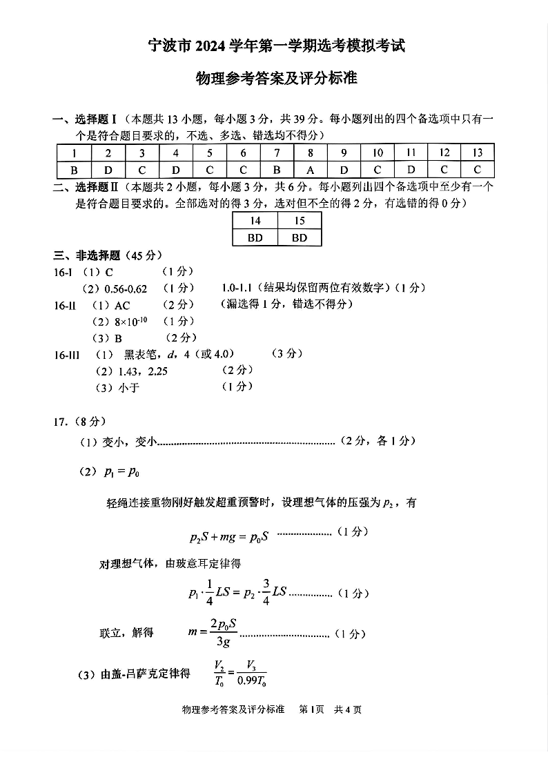 宁波市2024学年第一学期高三模拟考试+物理答案