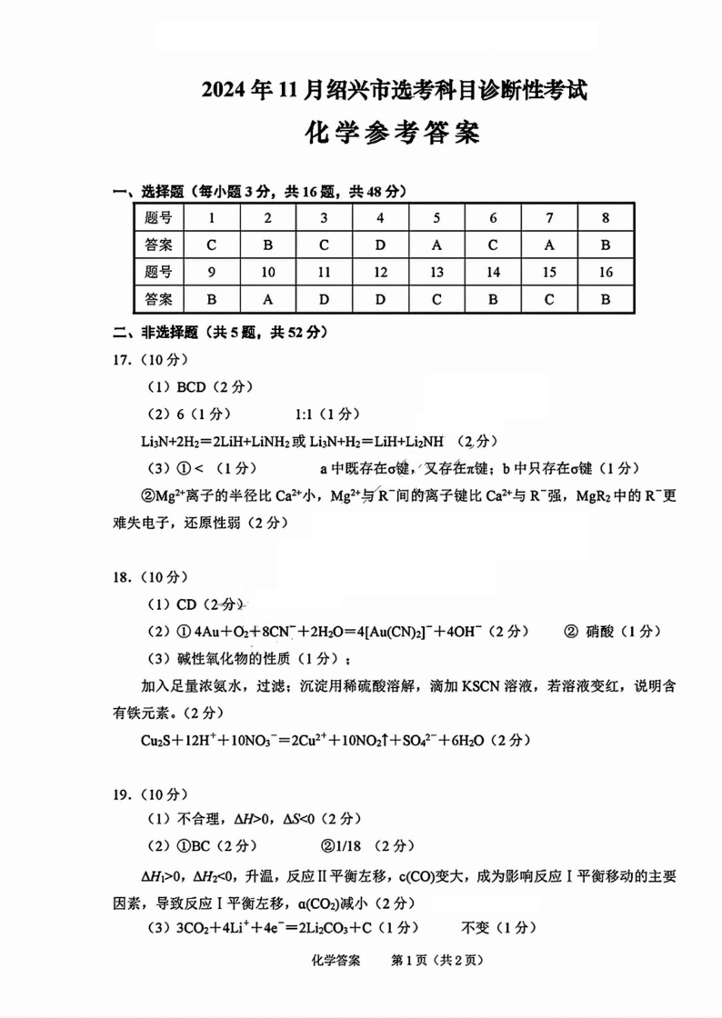 2024年11月绍兴市高考科目诊断性考试+化学答案
