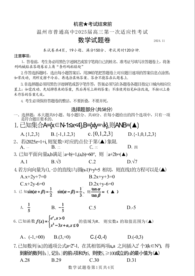浙江省温州市普通高中2025届高三第一次适应性考试+数学