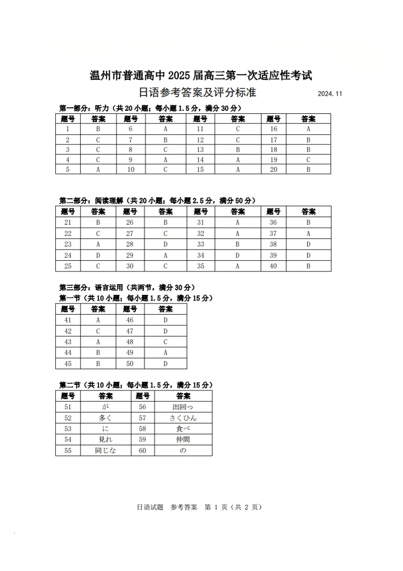 浙江省温州市普通高中2025届高三第一次适应性考试+日语答案