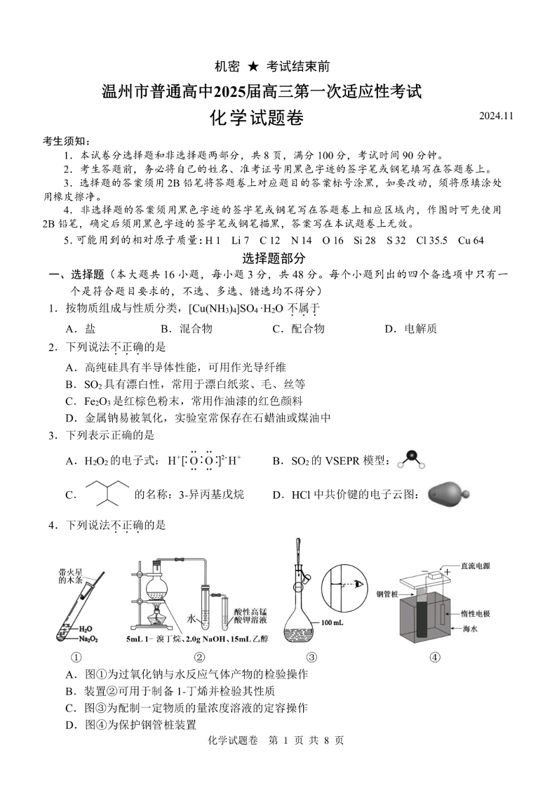 浙江省温州市普通高中2025届高三第一次适应性考试+化学