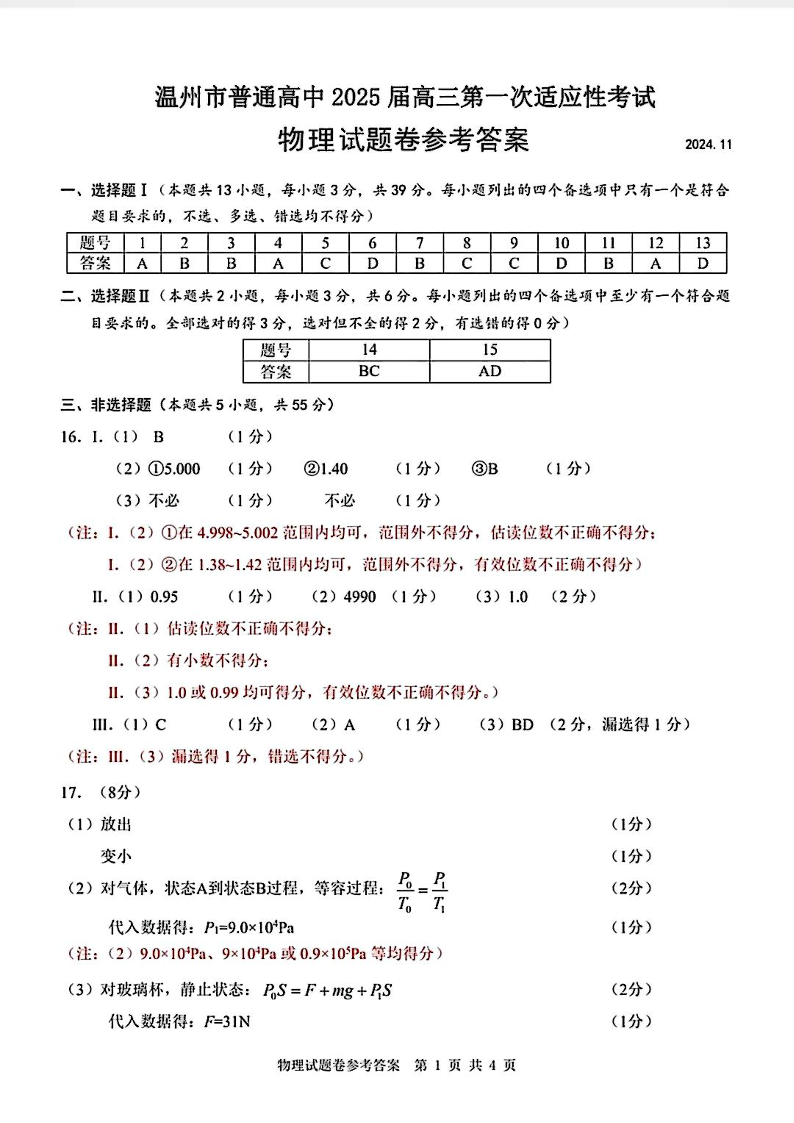 浙江省温州市普通高中2025届高三第一次适应性考试+物理答案