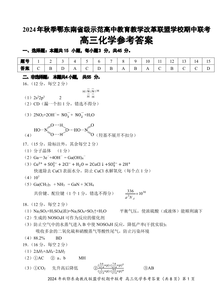 2025届湖北省鄂东南示范高中高三11月期中联考化学答案