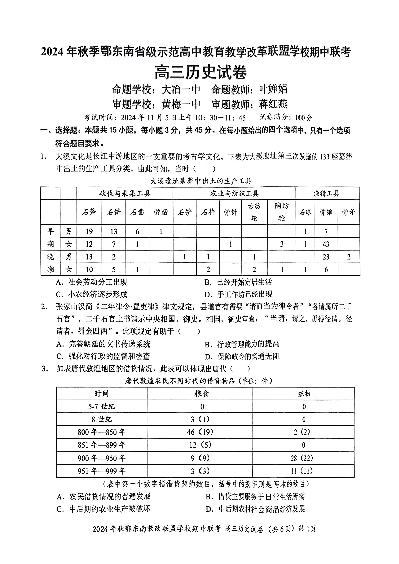 2025届湖北省鄂东南示范高中高三11月期中联考历史试卷