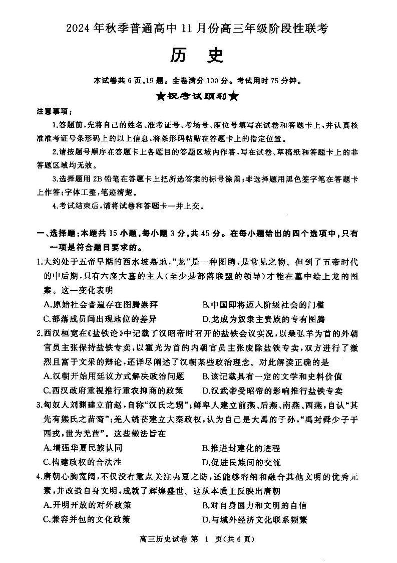 2025届湖北省鄂东协作体秋季普通高中11月份高三阶段性联考历史试卷