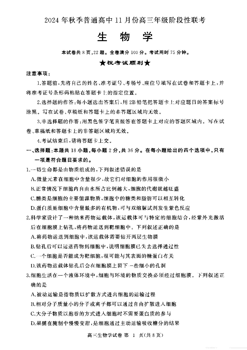 2025届湖北省鄂东协作体秋季普通高中11月份高三阶段性联考生物试题