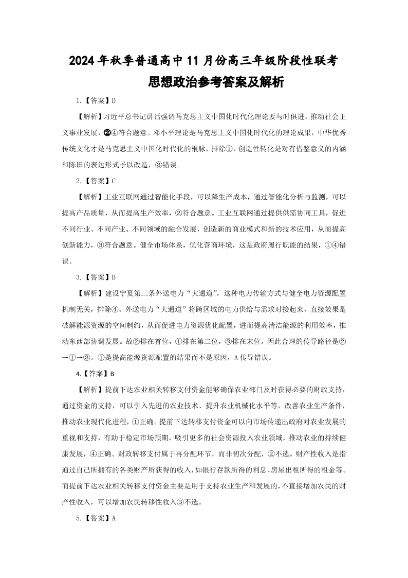2025届湖北省鄂东协作体秋季普通高中11月份高三阶段性联考政治答案