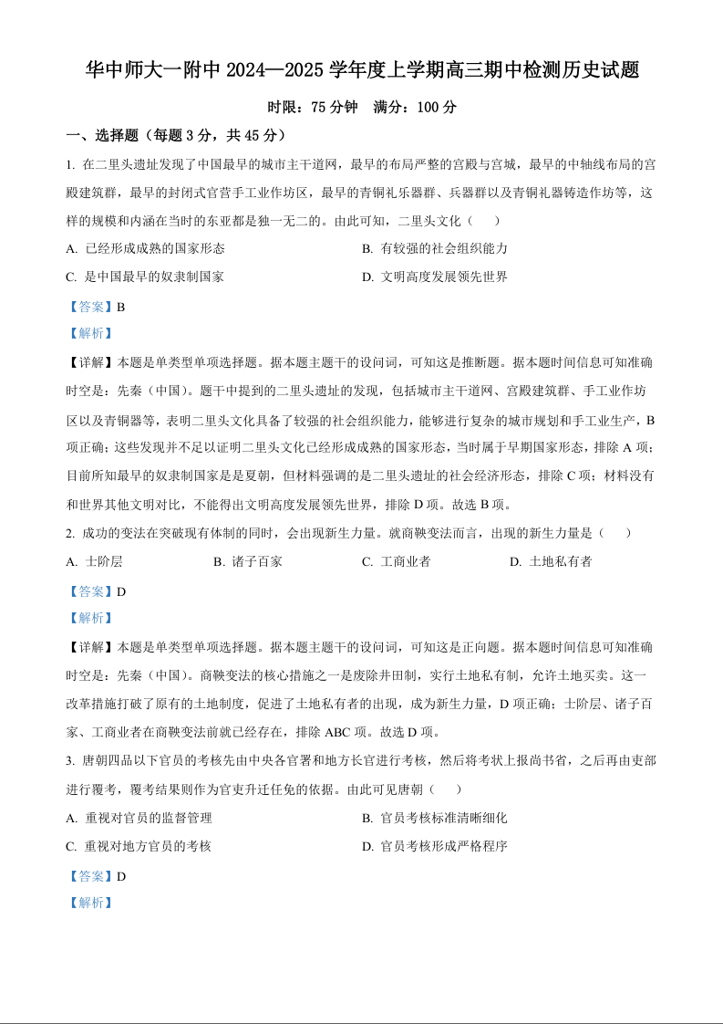 湖北省华中师大一附中2024-2025学年度上学期高三期中检测+历史答案