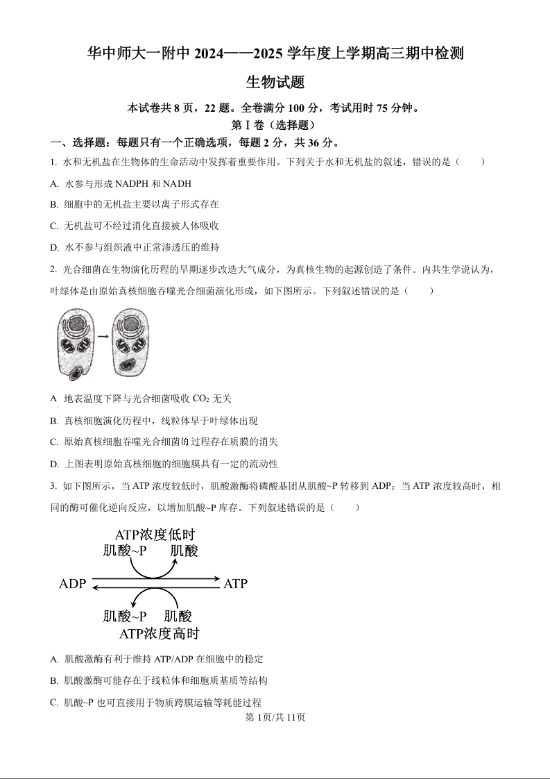 湖北省华中师大一附中2024-2025学年度上学期高三期中检测+生物