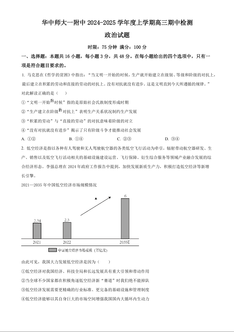湖北省华中师大一附中2024-2025学年度上学期高三期中检测+政治