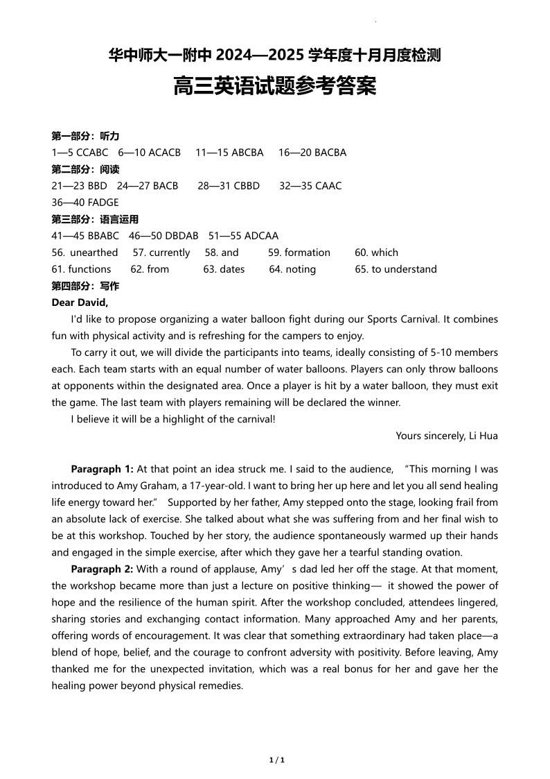 华中师大一附中2024-2025学年度十月月度检测+英语答案