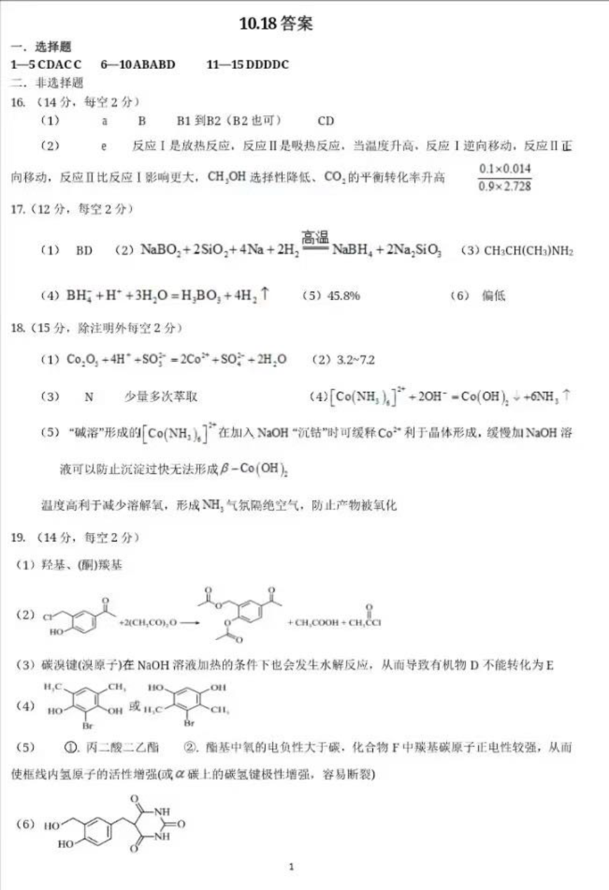 华中师大一附中2024-2025学年度十月月度检测+化学答案