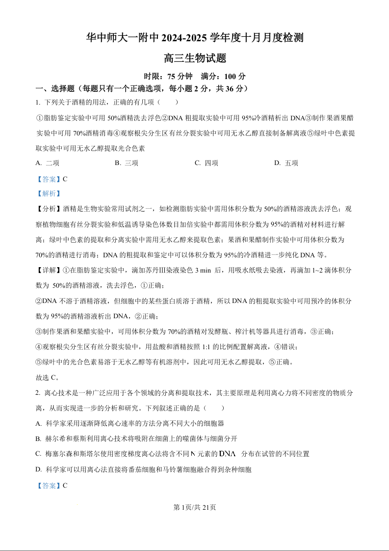 华中师大一附中2024-2025学年度十月月度检测+生物答案