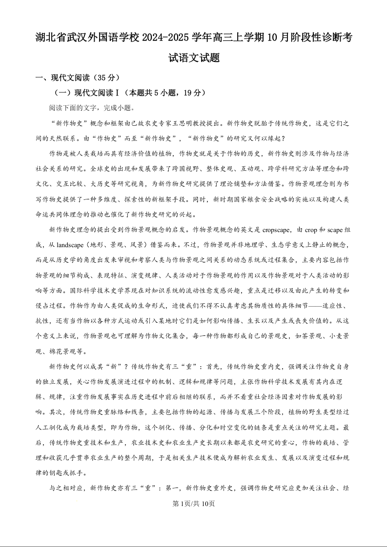 武汉外国语学校2024-2025学年度上学期10月阶段性诊断考试+语文