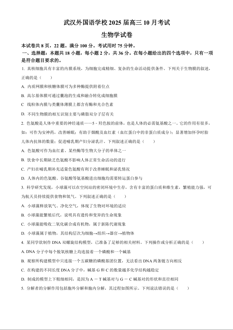 武汉外国语学校2024-2025学年度上学期10月阶段性诊断考试+生物