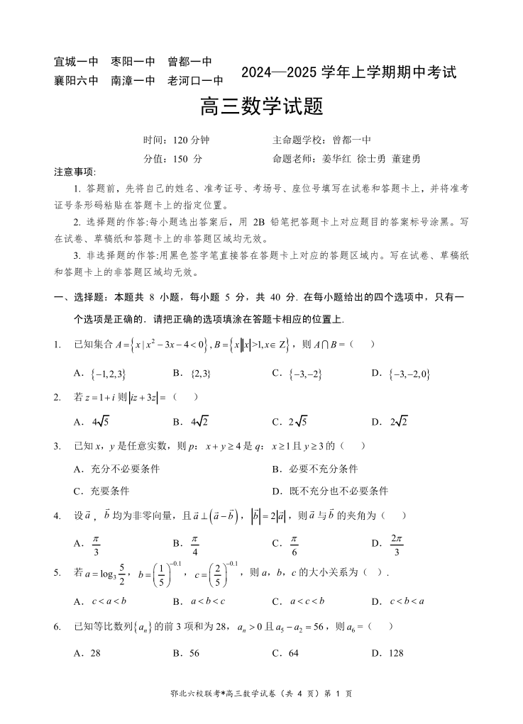 湖北省新高考协作体2024-2025学年高三上学期11月期中考试+数学