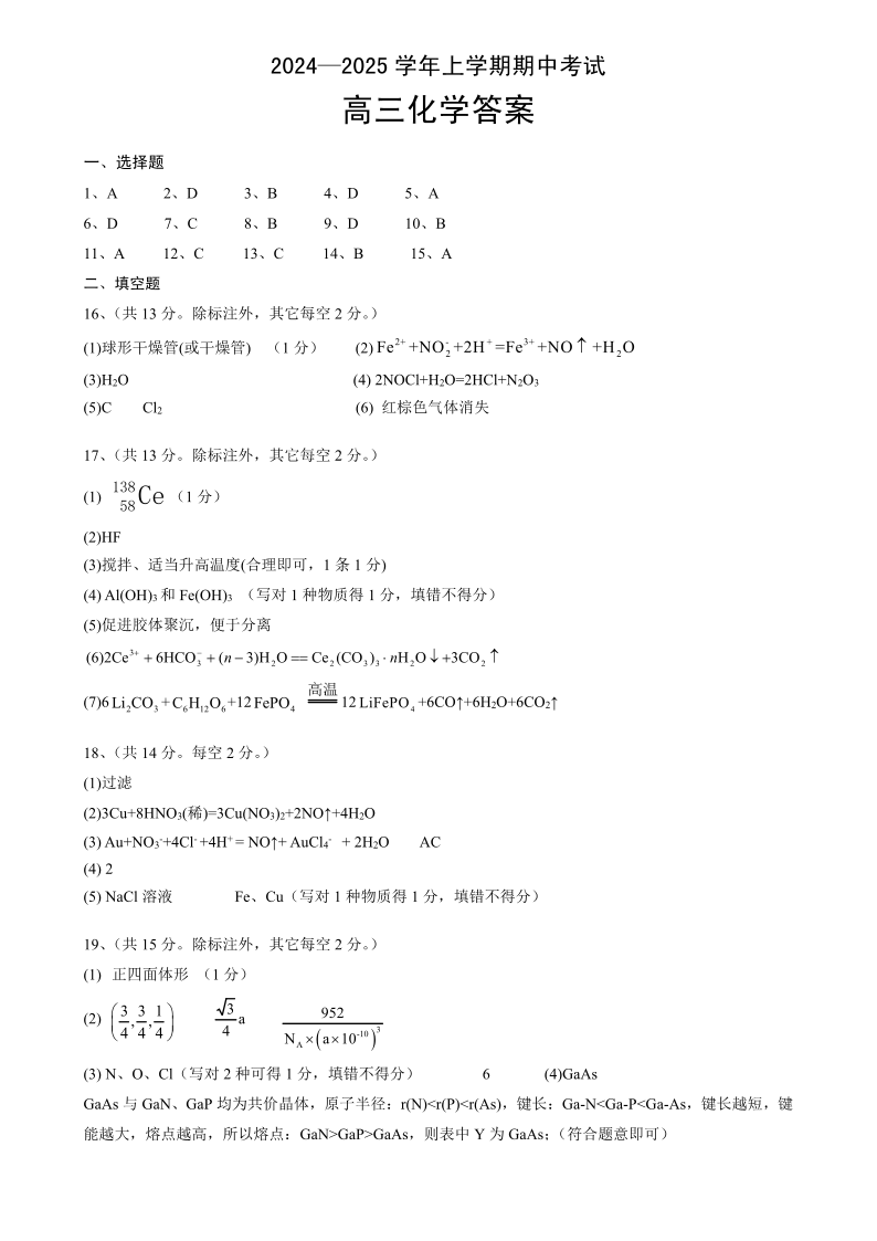 湖北省新高考协作体2024-2025学年高三上学期11月期中考试+化学答案