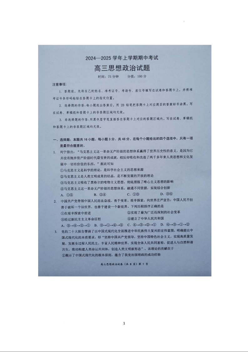 湖北省新高考协作体2024-2025学年高三上学期11月期中考试+政治