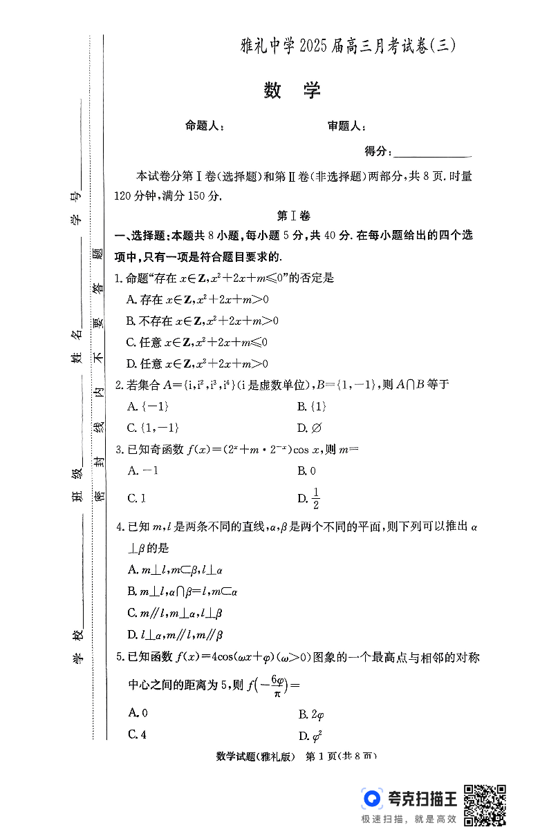 湖南省长沙市雅礼中学2025届高三11月考卷(三)数学