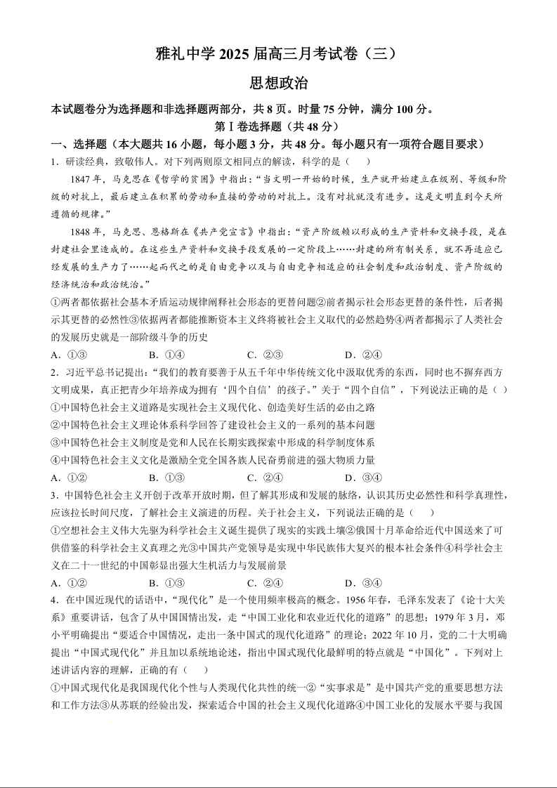 湖南省长沙市雅礼中学2025届高三11月考卷(三)政治及答案