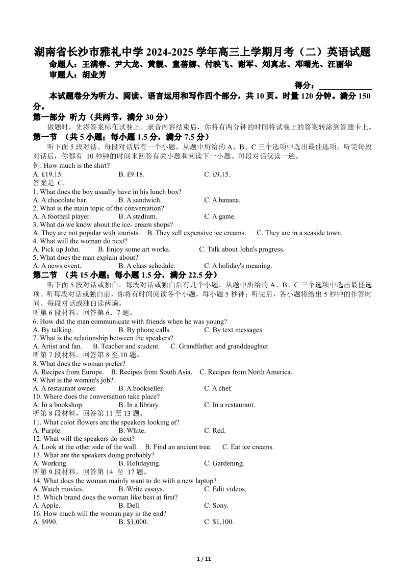 湖南省雅礼中学2025届高三上学期月考试卷(二+)英语