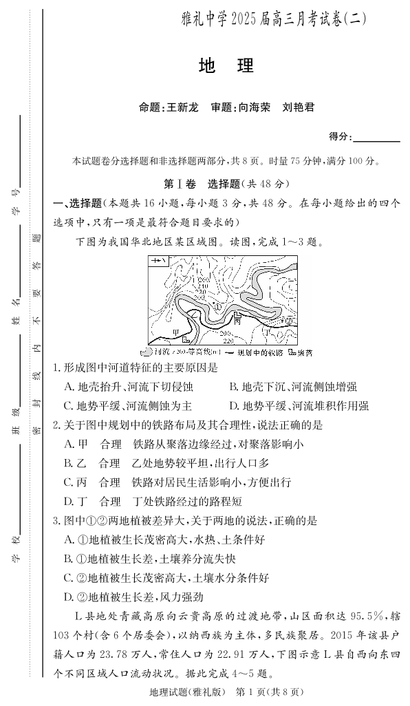 湖南省雅礼中学2025届高三上学期月考试卷(二+)地理