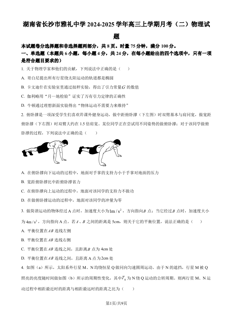 湖南省雅礼中学2025届高三上学期月考试卷(二+)物理