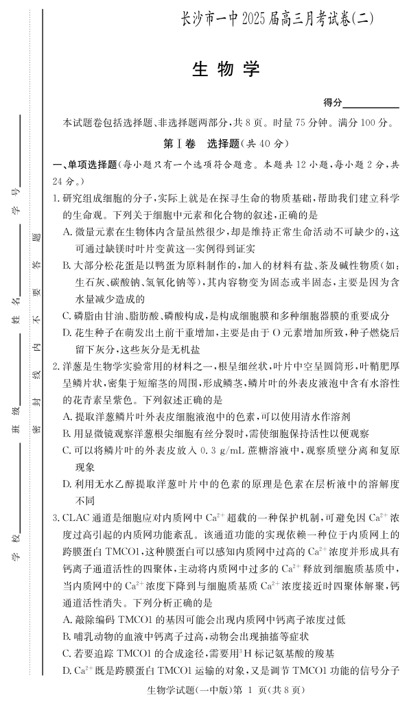 长沙市一中2025届高三月考试卷(二)生物