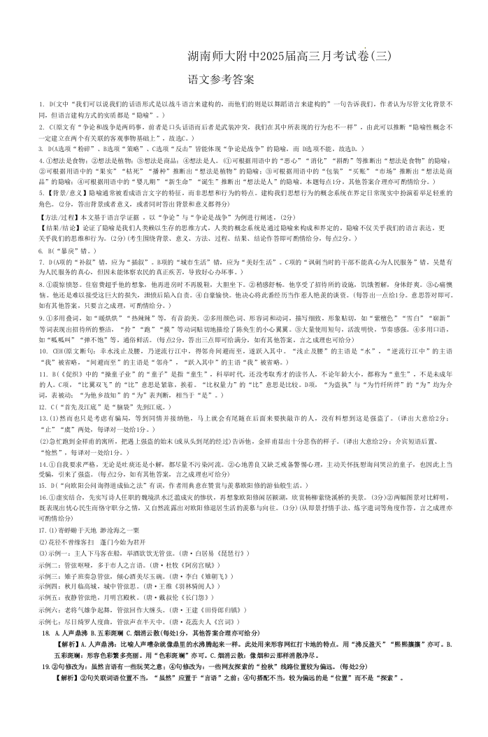 湖南师范大学附属中学2025届高三月考卷(三)语文答案