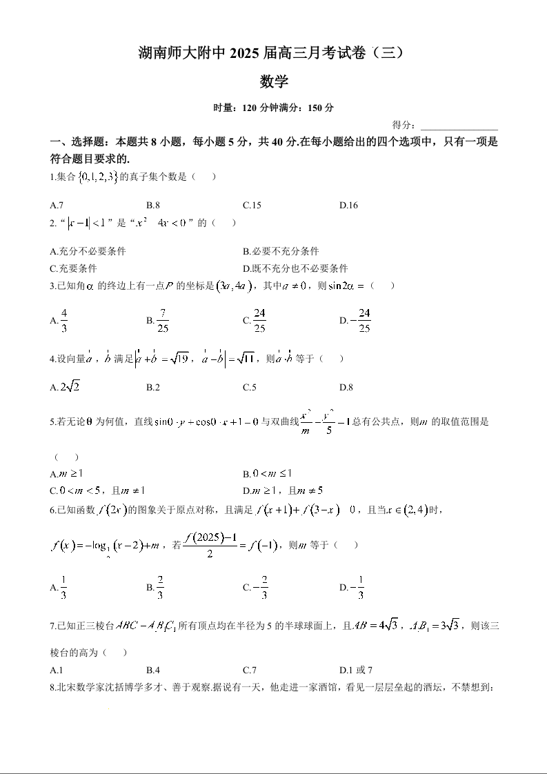 湖南师范大学附属中学2025届高三月考卷(三)数学