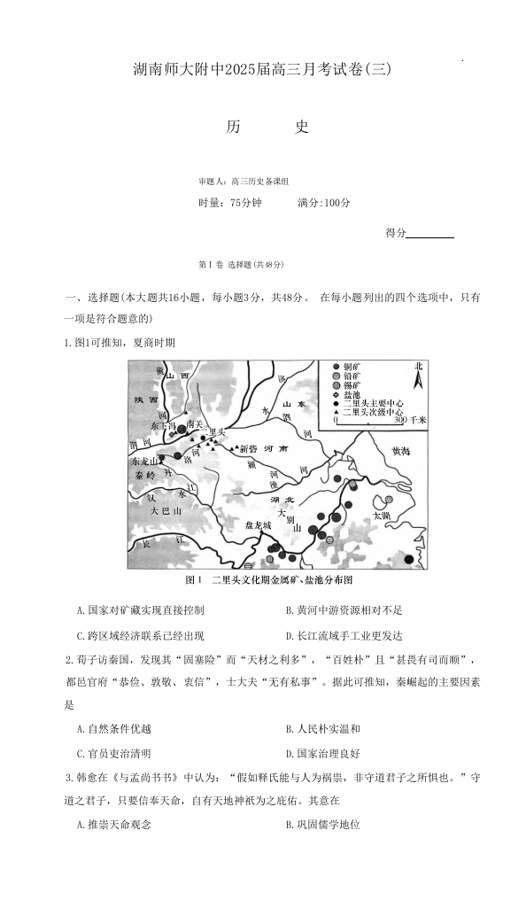 湖南师范大学附属中学2025届高三月考卷(三)历史