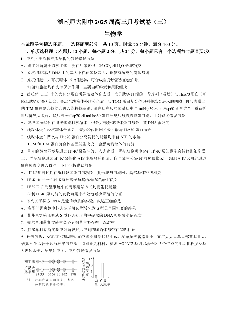 湖南师范大学附属中学2025届高三月考卷(三)生物