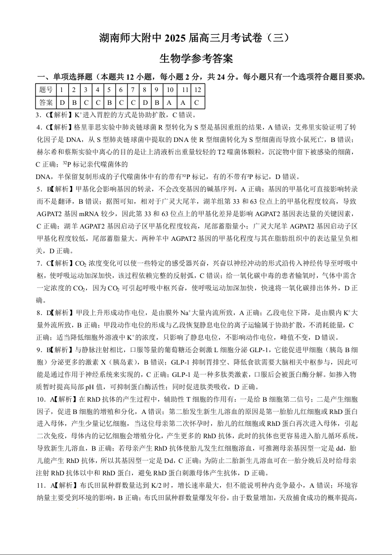 湖南师范大学附属中学2025届高三月考卷(三)生物答案