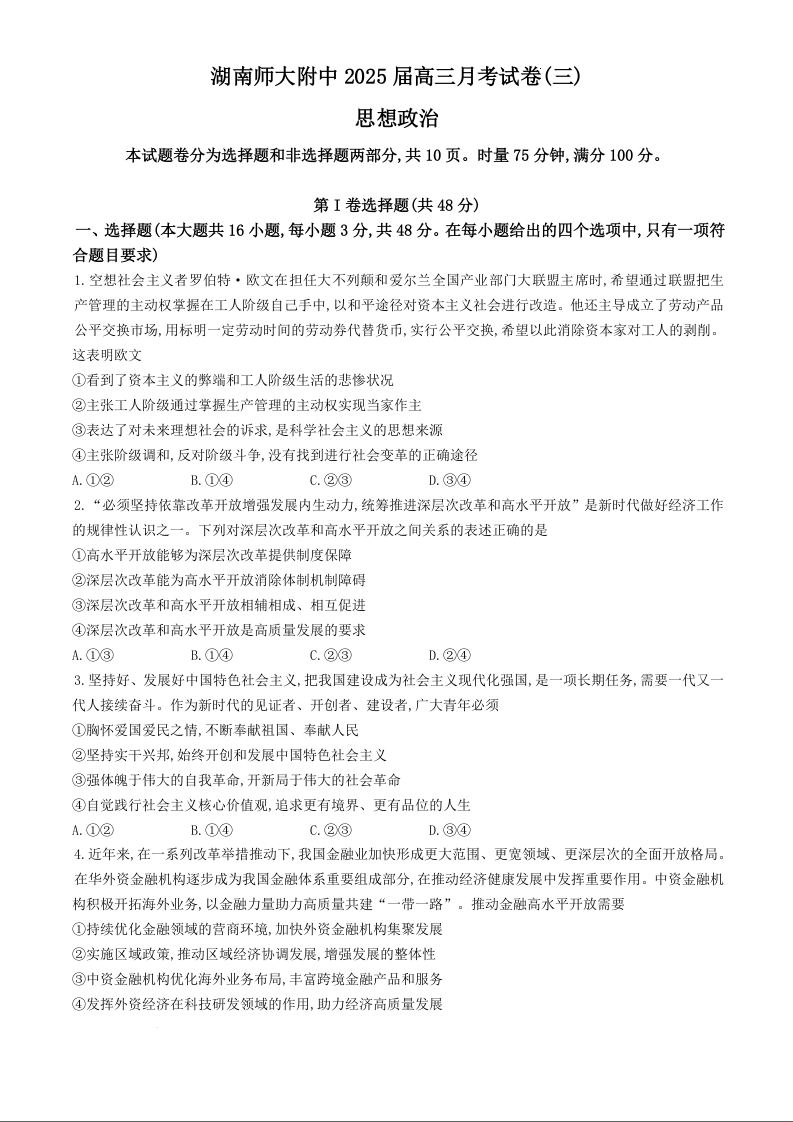 湖南师范大学附属中学2025届高三月考卷(三)政治