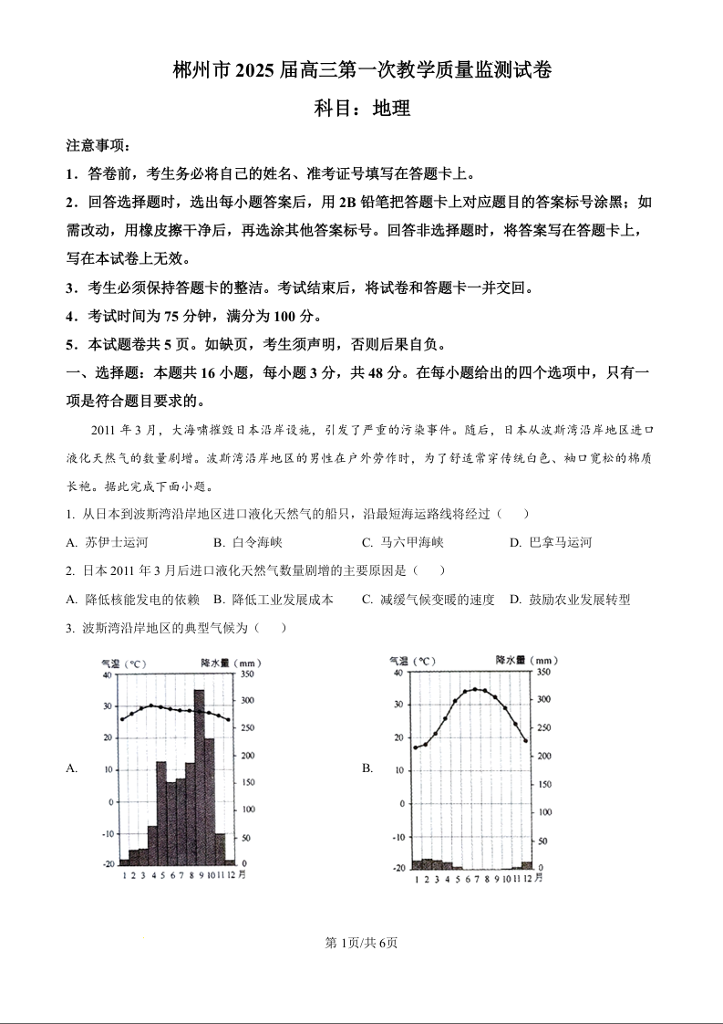 湖南省郴州市2025届高三上学期第一次模拟考试+地理