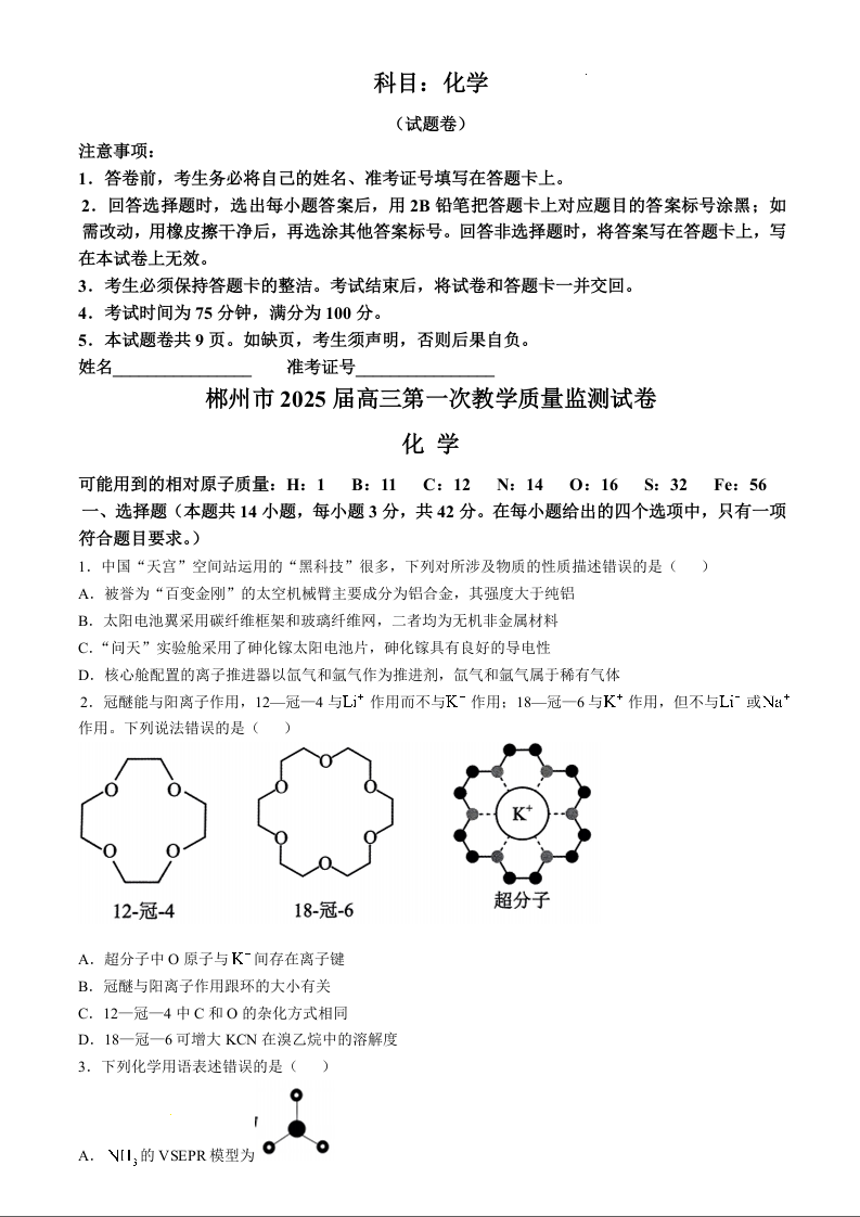 湖南省郴州市2025届高三上学期第一次模拟考试+化学