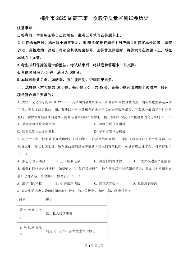 湖南省郴州市2025届高三上学期第一次模拟考试+历史
