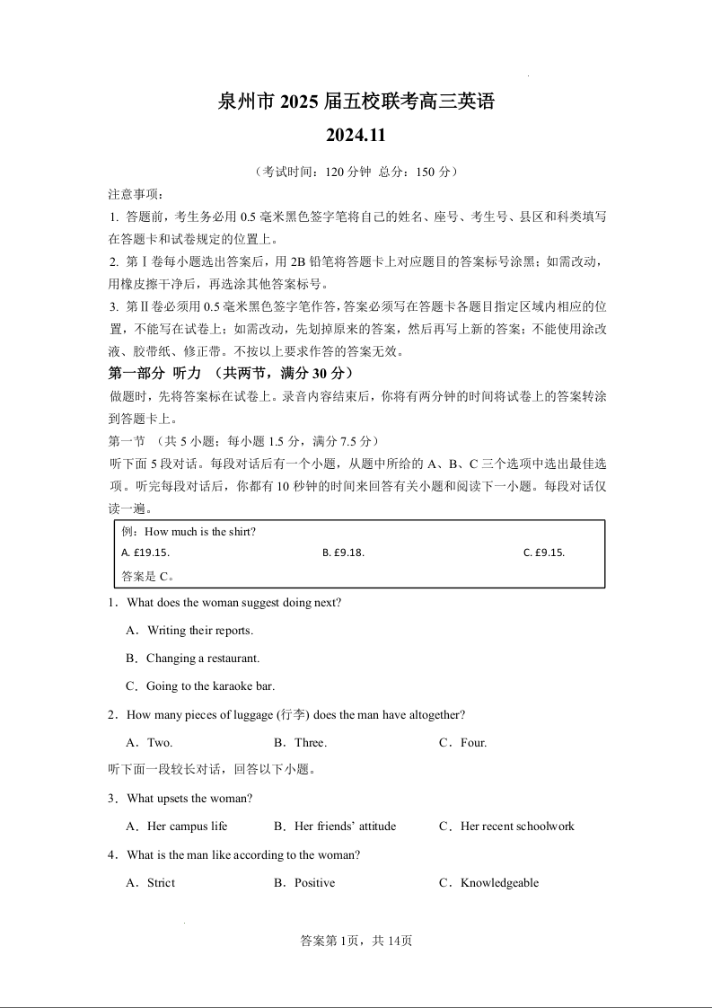 泉州市2025届高三毕业班五校联考+英语