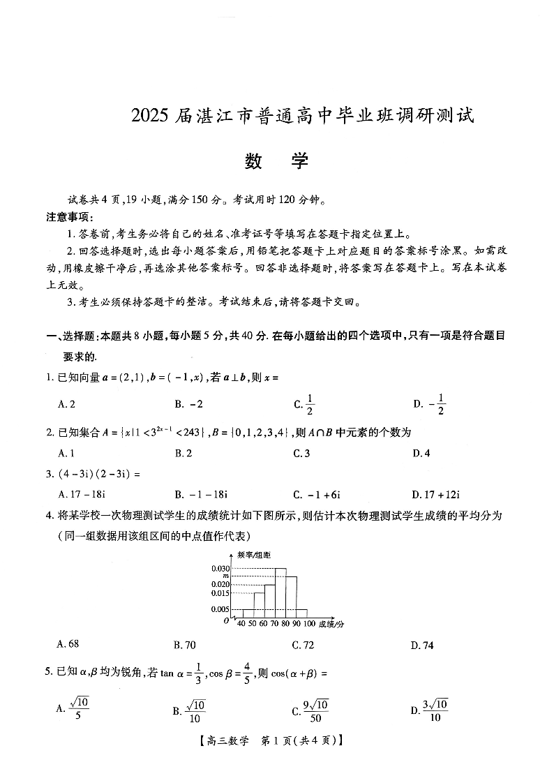 2025届湛江市普通高中毕业班10月调研测试+数学