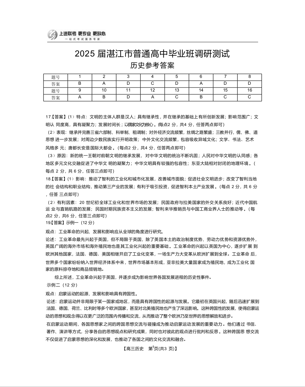2025届湛江市普通高中毕业班10月调研测试+历史答案