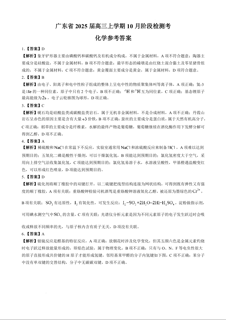 广东省2025届高三上学期10月阶段检测考+化学答案