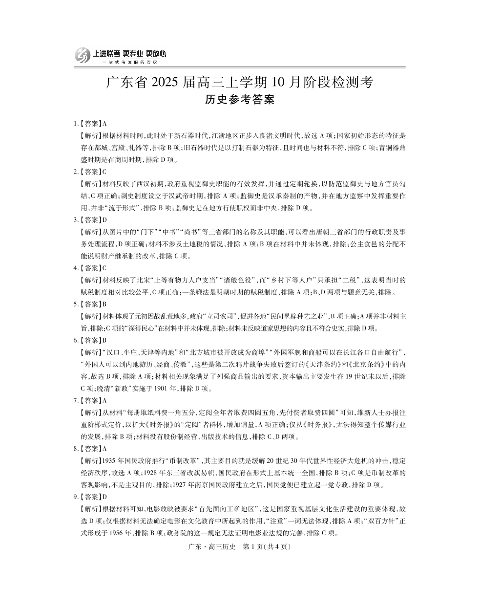 广东省2025届高三上学期10月阶段检测考+历史答案