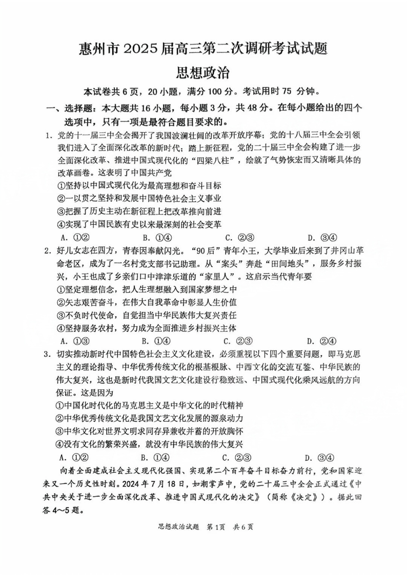 广东省惠州市2025届高三第二次调研考试(惠州二调)政治