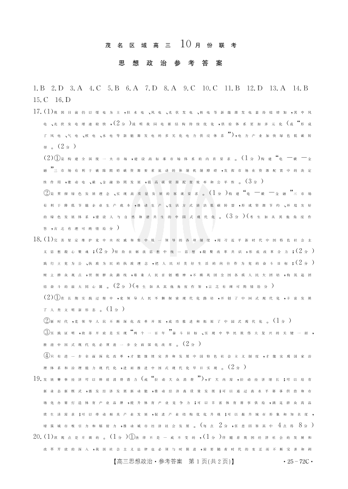 广东省茂名市2025届高三10月联考+政治答案