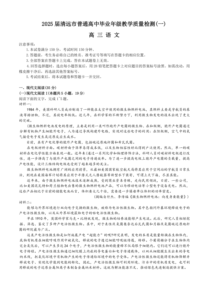 广东省清远市2024-2025学年高三上学期第一次模拟考试+语文