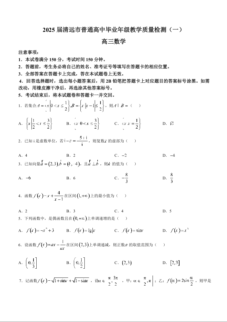 广东省清远市2024-2025学年高三上学期第一次模拟考试+数学
