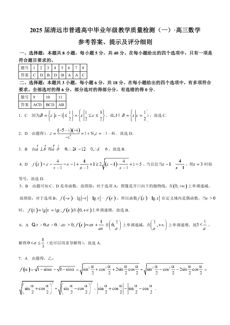 广东省清远市2024-2025学年高三上学期第一次模拟考试+数学答案