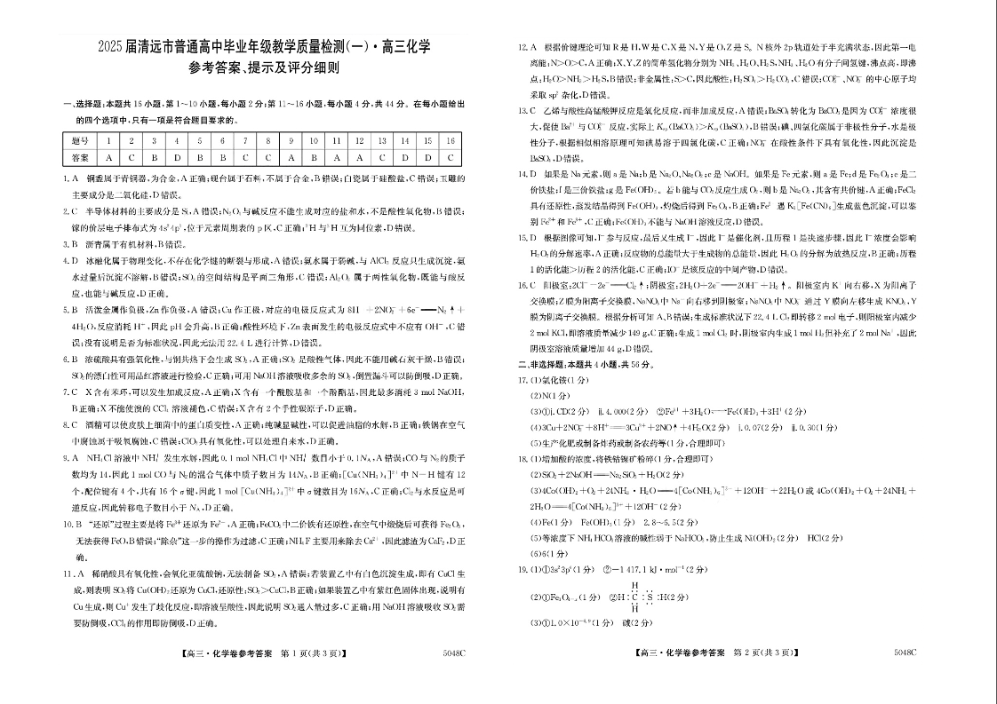 广东省清远市2024-2025学年高三上学期第一次模拟考试+化学答案