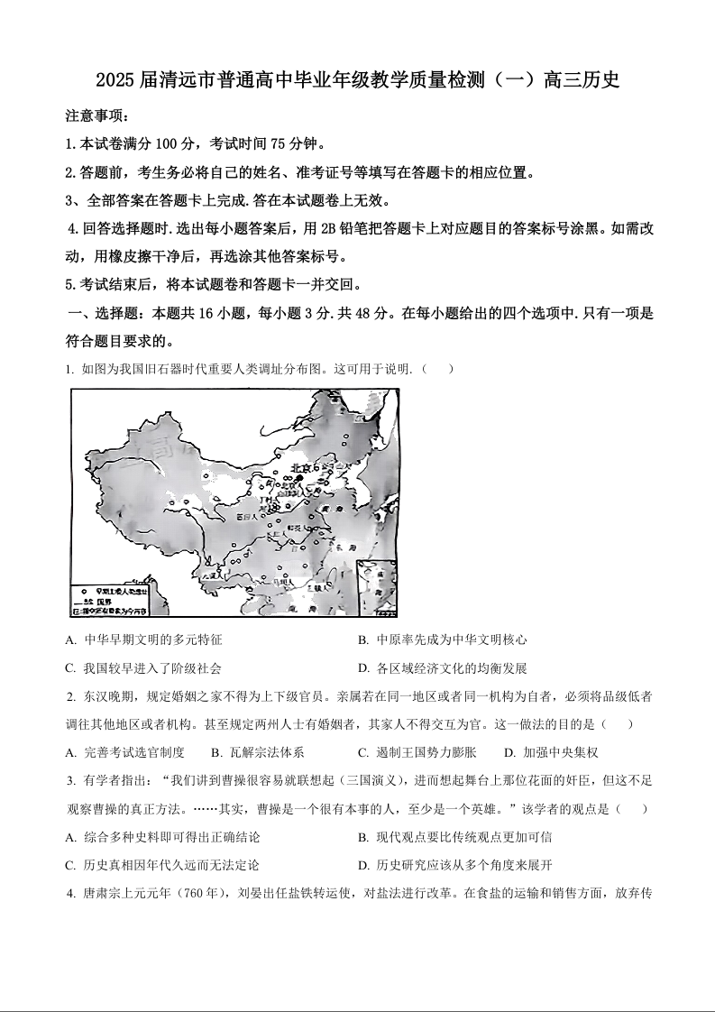 广东省清远市2024-2025学年高三上学期第一次模拟考试+历史