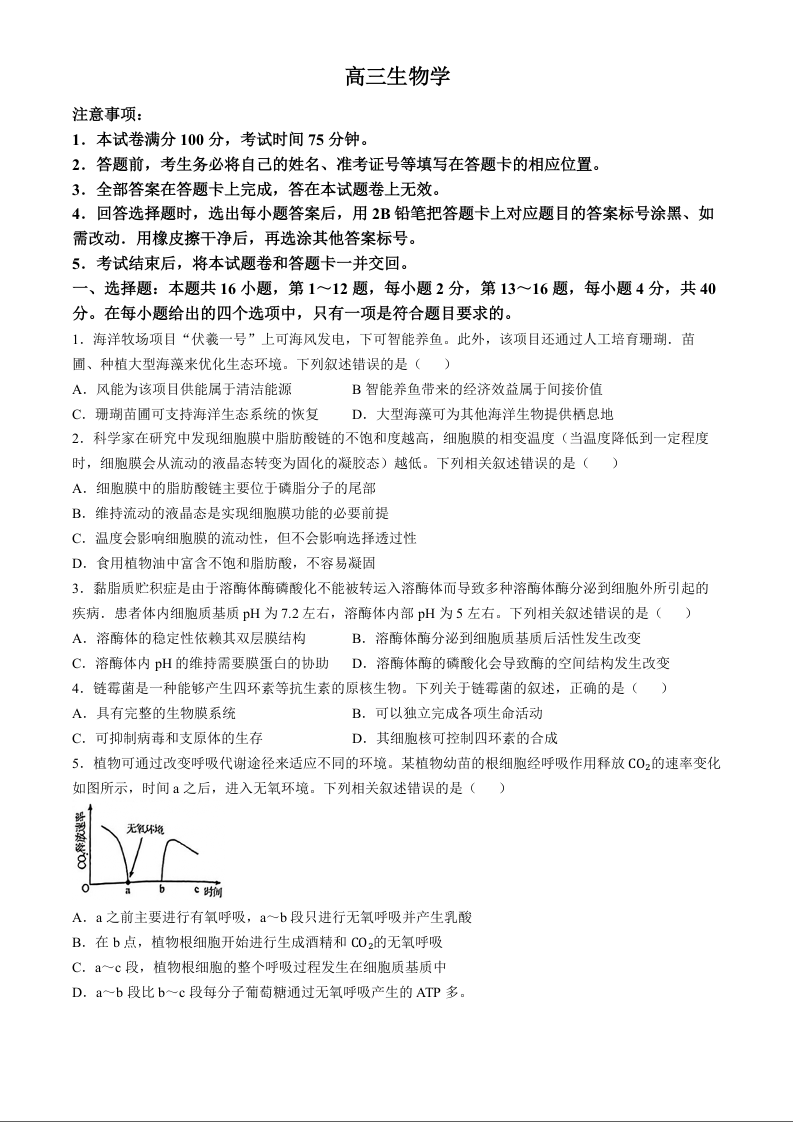 广东省清远市2024-2025学年高三上学期第一次模拟考试+生物